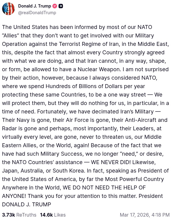 Israel and the US have one thing in common: They know no friends or allies, they only know "useful idiots". Dear leaders of the world: Don't be idiots. https://x.com/WhiteHouse/status/2038939688946311321