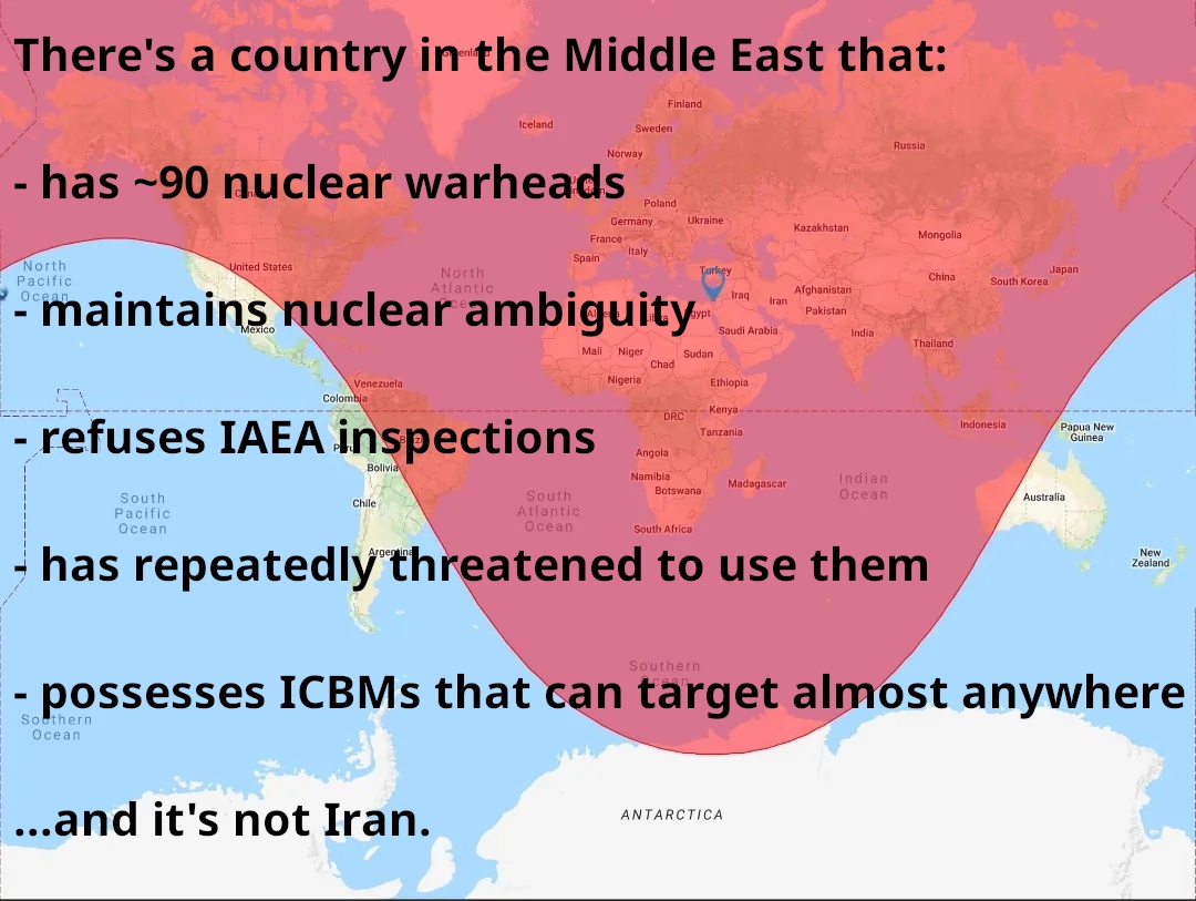 There's a country in the Middle East that: - has ~90 nuclear warheads - maintains nuclear ambiguity - refuses IAEA inspections - has repeatedly threatened to use them - possesses ICBMs that can target almost anywhere …and it's not Iran.