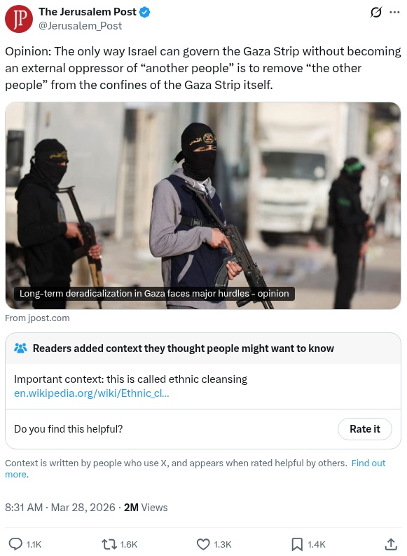 I endorse military intervention to stop the Genocide in Gaza and protect the Palestinian people. And the people of Yemen. And the people of Lebanon. And the people of Iran. And the people of Syria. ... https://x.com/LePapillonBlu2/status/2044525341218054585