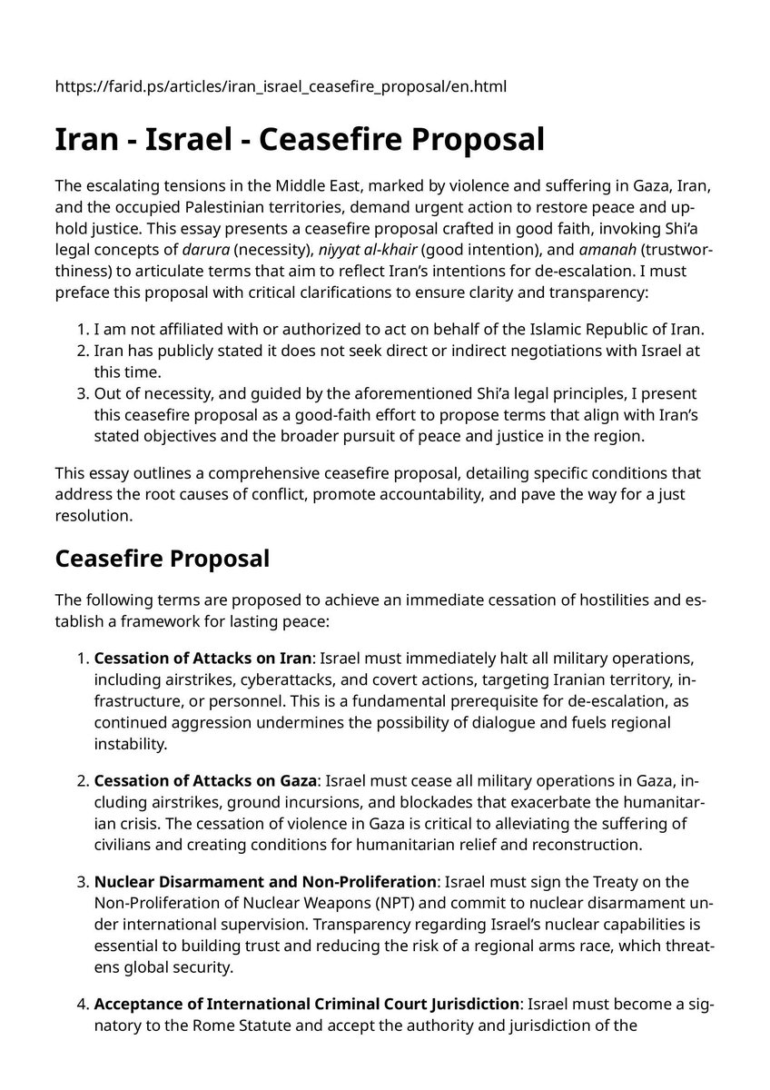 I've published this Iran-Israel-Ceasefire-Proposal on Jun 15, 2025. Aligns remarkably well with Iran's conditions for a ceasefire now. https://farid.ps/articles/iran_israel_ceasefire_proposal/en.html https://x.com/R34lB0rg/status/1934132149671641517