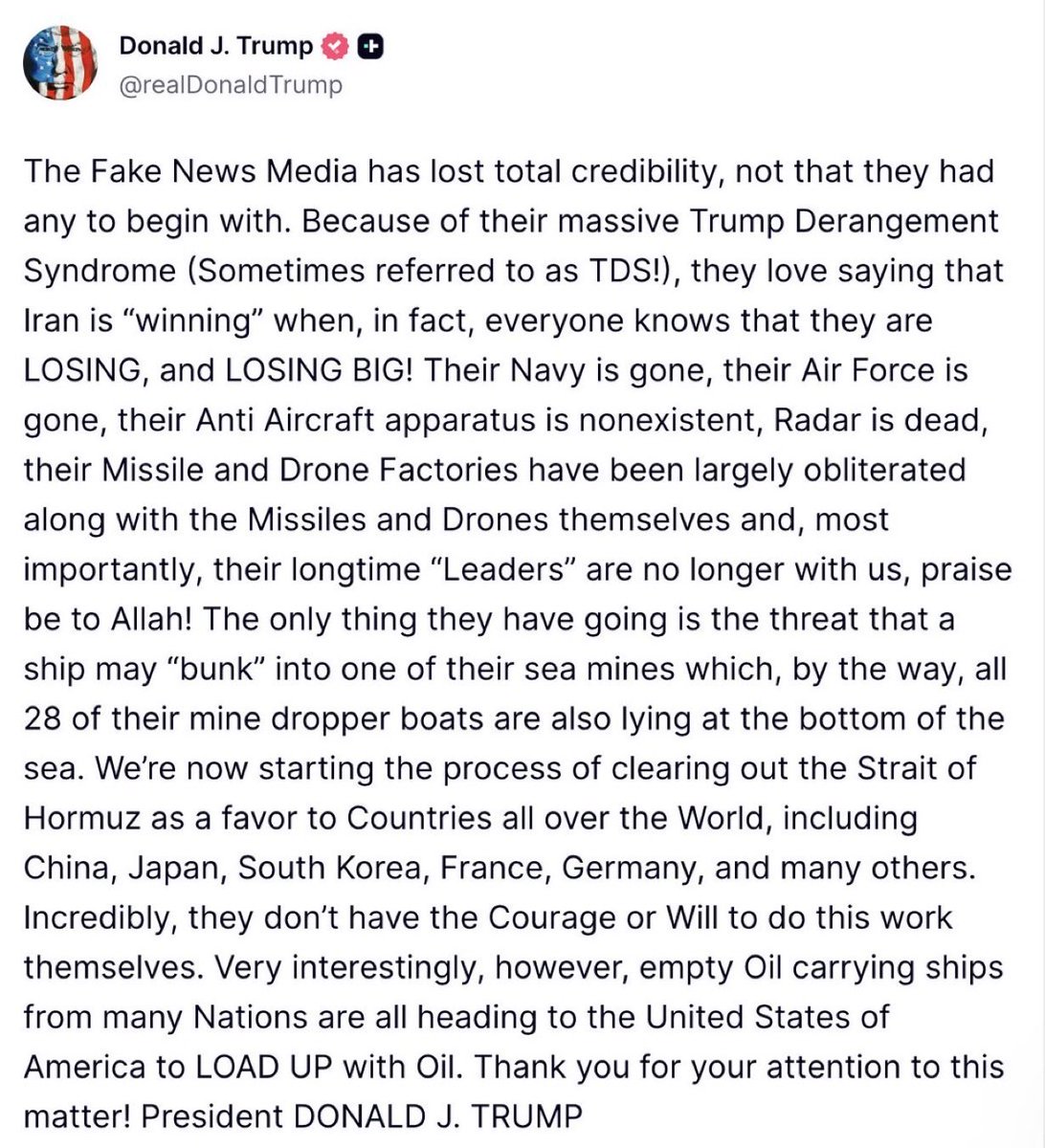 Trump Derangement Syndrome on Fake News Media: Claiming victory while Iran has destroyed most of US radar stations, several aircraft, and the Navy doesn't dare to approach the Strait of Hormuz. "Praise be to Allah" is the only Truth in his post.
