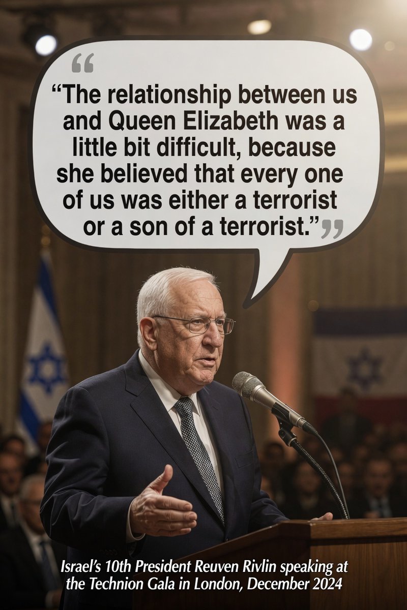 Israel's 10th President Reuven Rivlin speaking at the Technion Gala in London, December 2024: "The relationship between us and Queen Elizabeth was a bit difficult, because she believed that every one of us was either a terrorist or a son of a terrorist."